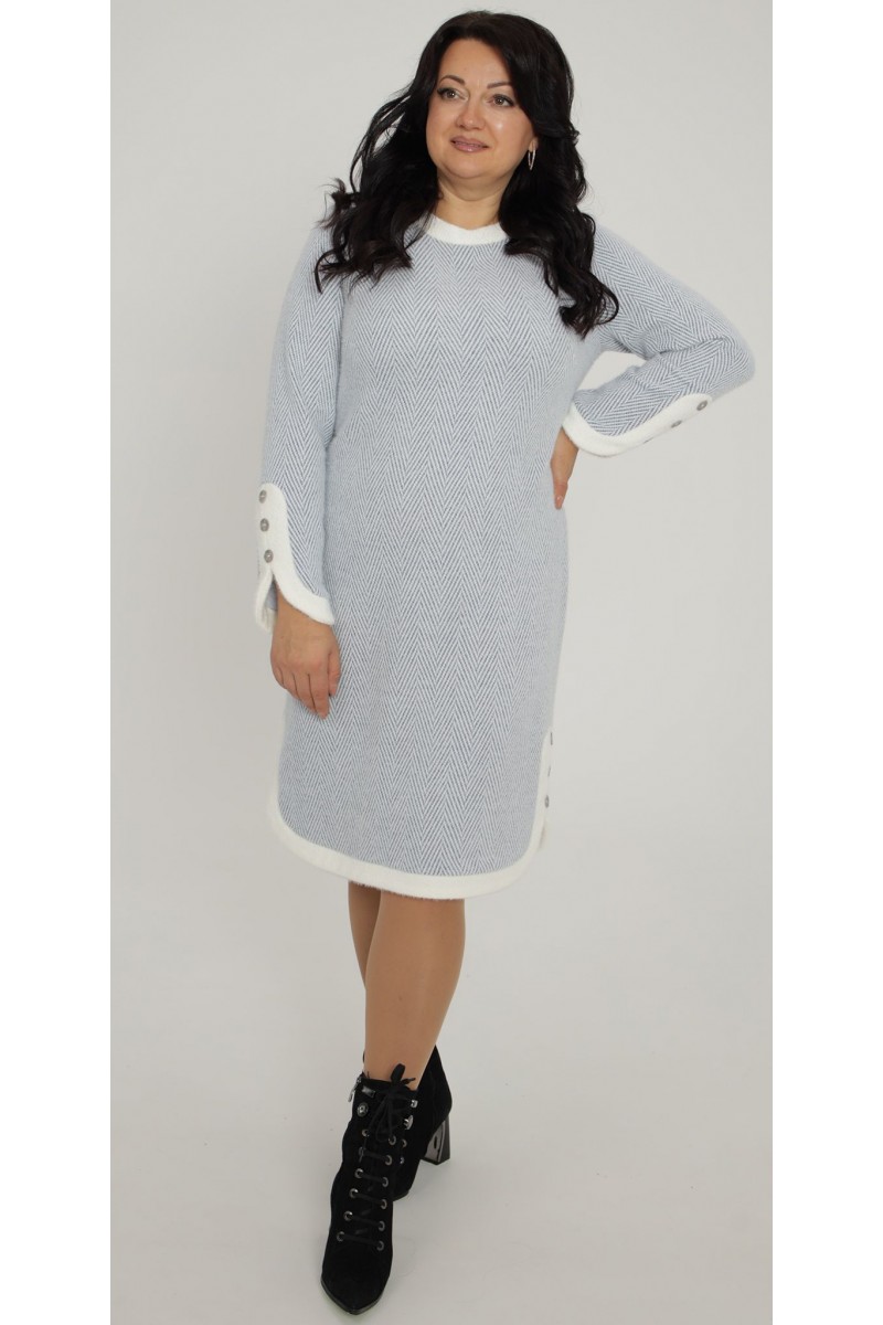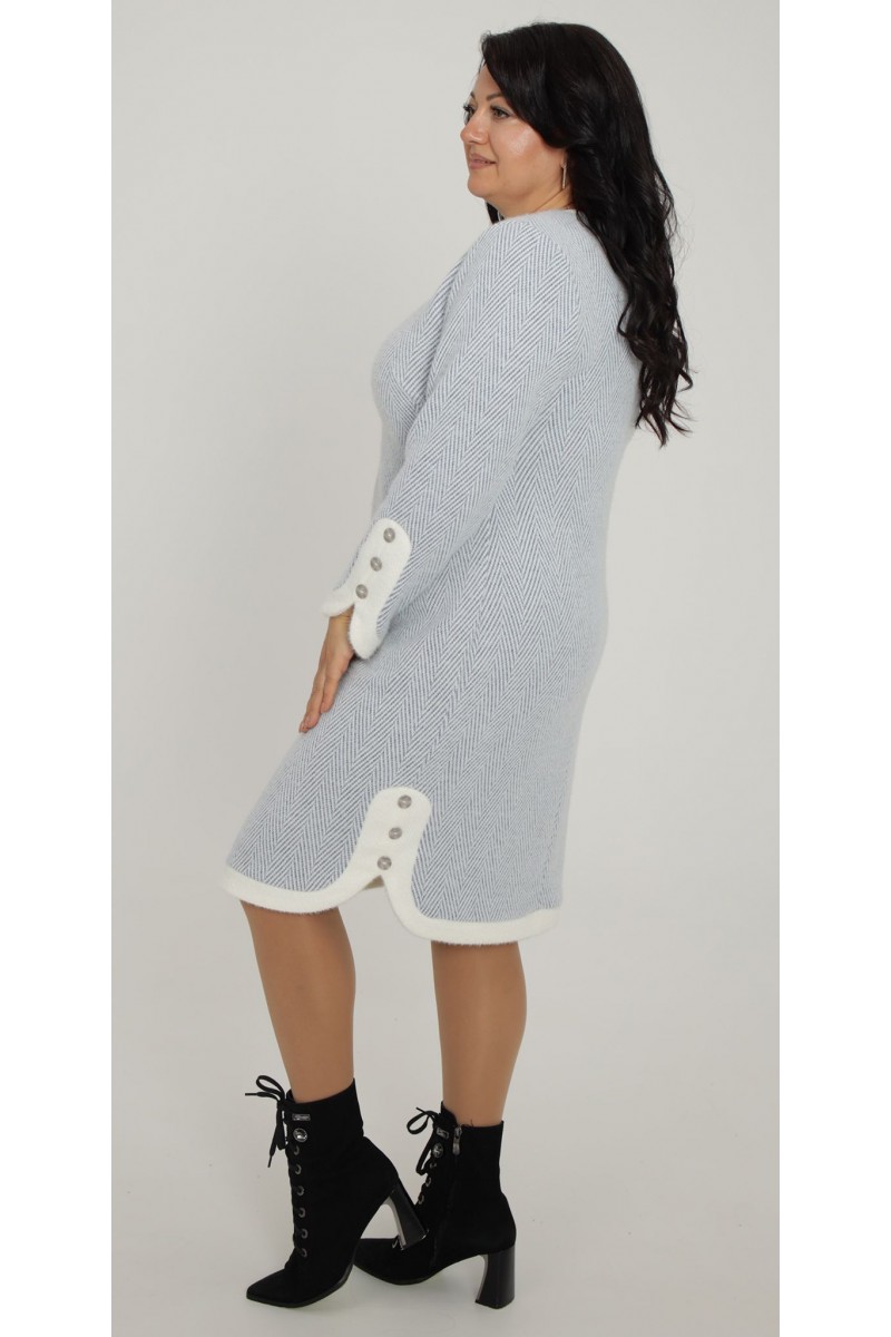 Ангоровое платье прямого силуэта из мягкой, приятной к телу ткани. Имеет элегантную длину меди и аккуратную обработку контрастной белой тесьмой по низу и манжетам. Изюминка модели – декоративные пуговицы на рукавах и по бокам, которые придают образу изящества и шарма.