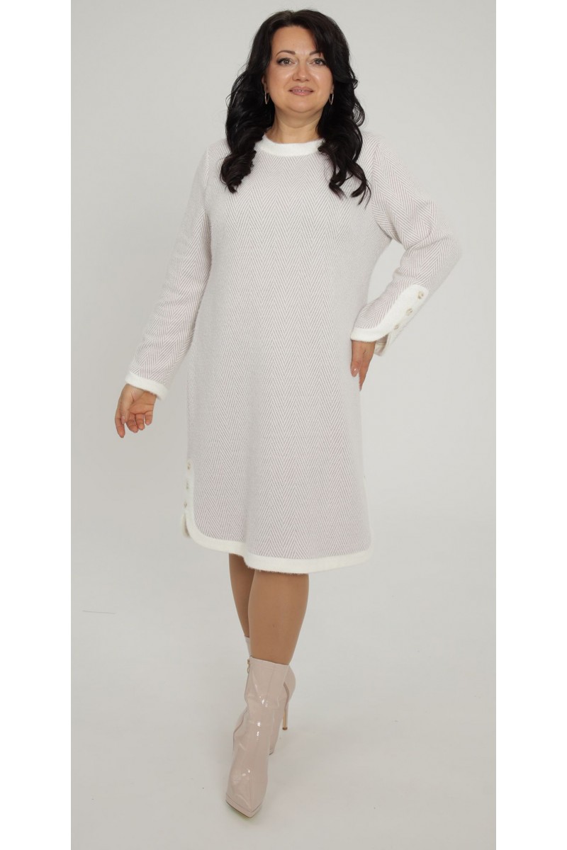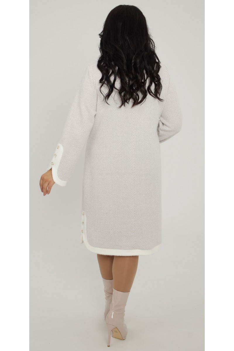 Ангоровое платье прямого силуэта из мягкой, приятной к телу ткани. Имеет элегантную длину меди и аккуратную обработку контрастной белой тесьмой по низу и манжетам. Изюминка модели – декоративные пуговицы на рукавах и по бокам, которые придают образу изящества и шарма.