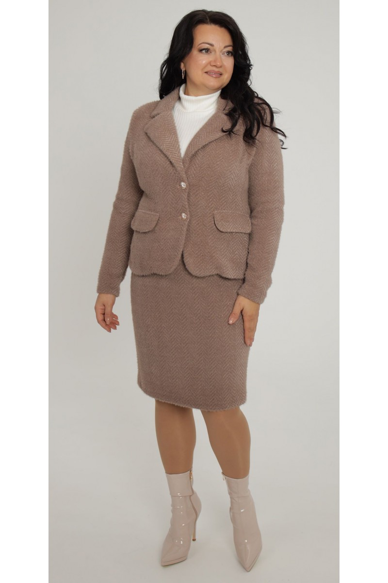 Элегантный теплый костюм 2025 из мягкой ангорской альпаки – идеальное сочетание уюта и стиля. Комплект состоит из приталенного жакета с классическим воротником и юбки прямого силуэта длиной до колена.
